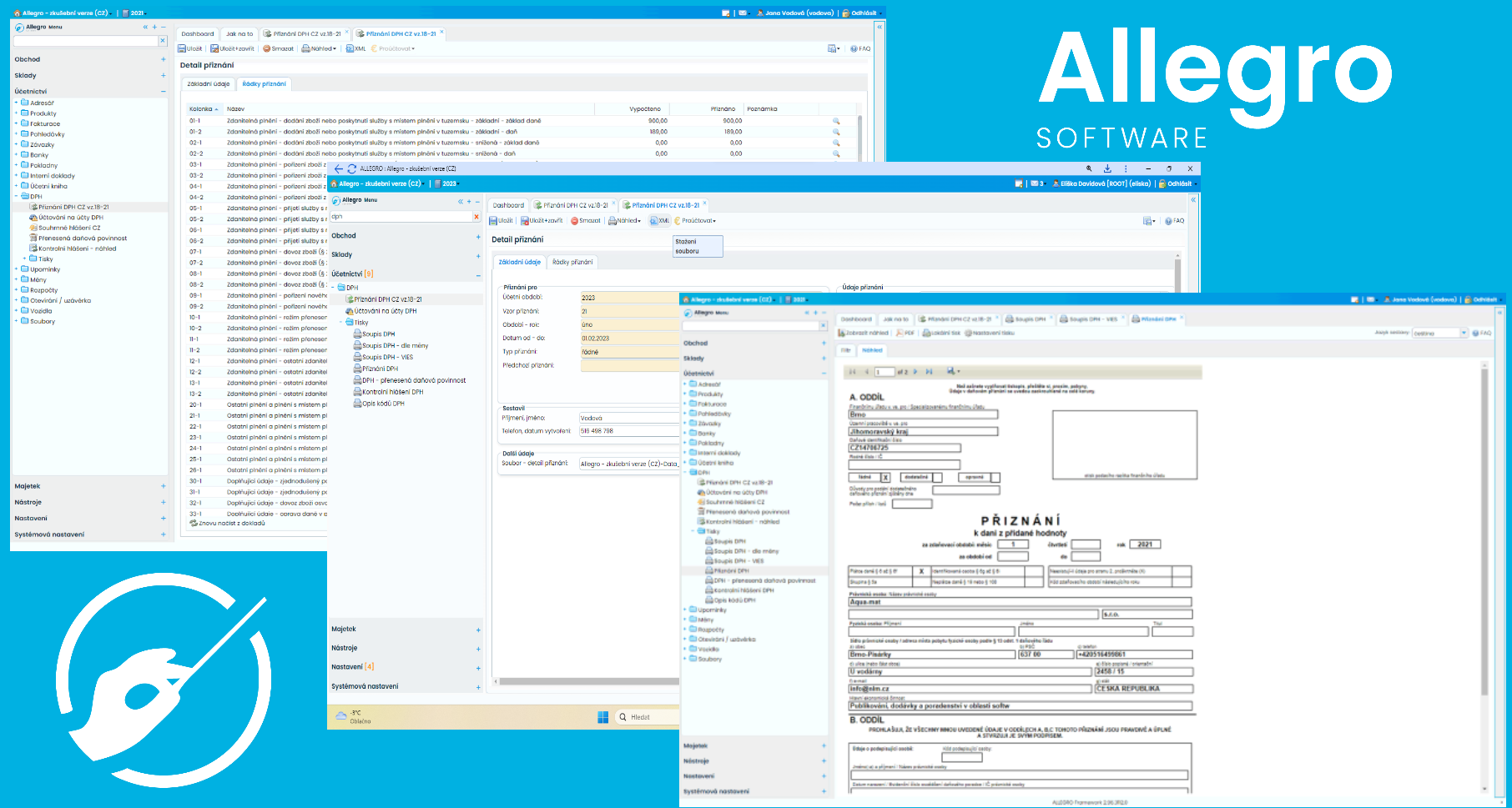 Allegro Software je kromě obchodního, i daňový software, který vygeneruje přiznání k DPH na základě evidovaných dokladů (včetně přiznání DPH v režimu OSS) kontrolního či souhrnného hlášení. Jak zaslat přiznání DPH elektronicky? Vytvořený tiskopis ve formátu .xml můžete nahrát do systému EPO nebo rovnou odeslat datovou schránkou.