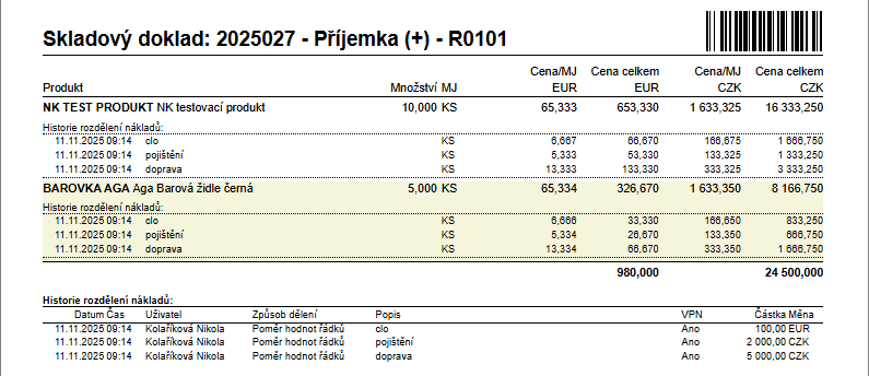 Rozpuštění vedlejších pořizovacích nákladů do příjemky je nyní přehlednější. Nově se ukládají detailní informace o rozpočítaných částkách až na úroveň jednotlivých řádků. Díky tomu máte vždy jasný přehled, jak se vedlejší náklady promítly do hodnoty konkrétních položek.Přibyla také možnost zrušit rozpočítání nákladů, pokud potřebujete provést úpravu (doposud bylo nutné zadat náklad znovu s mínusem). Detailní přehled rozpočítaných částek je nyní dostupný v reportu skladového dokladu a v příští verzi bude viditelný i přímo v detailu dokladu.